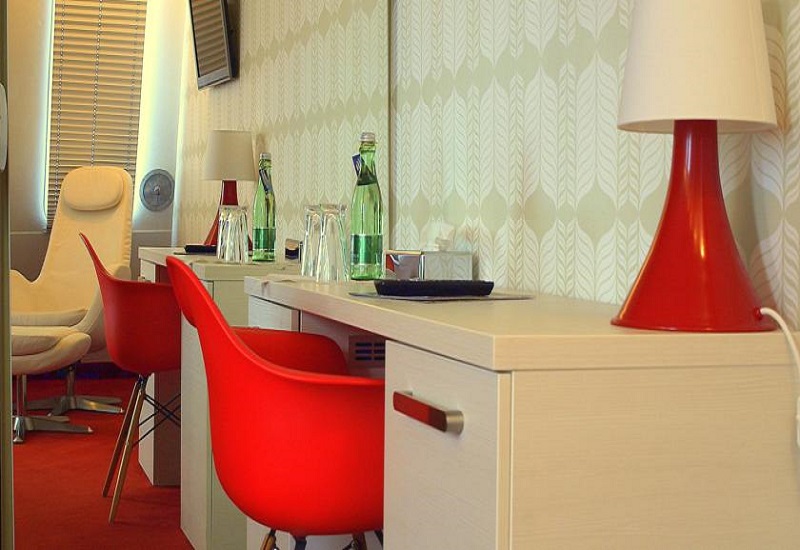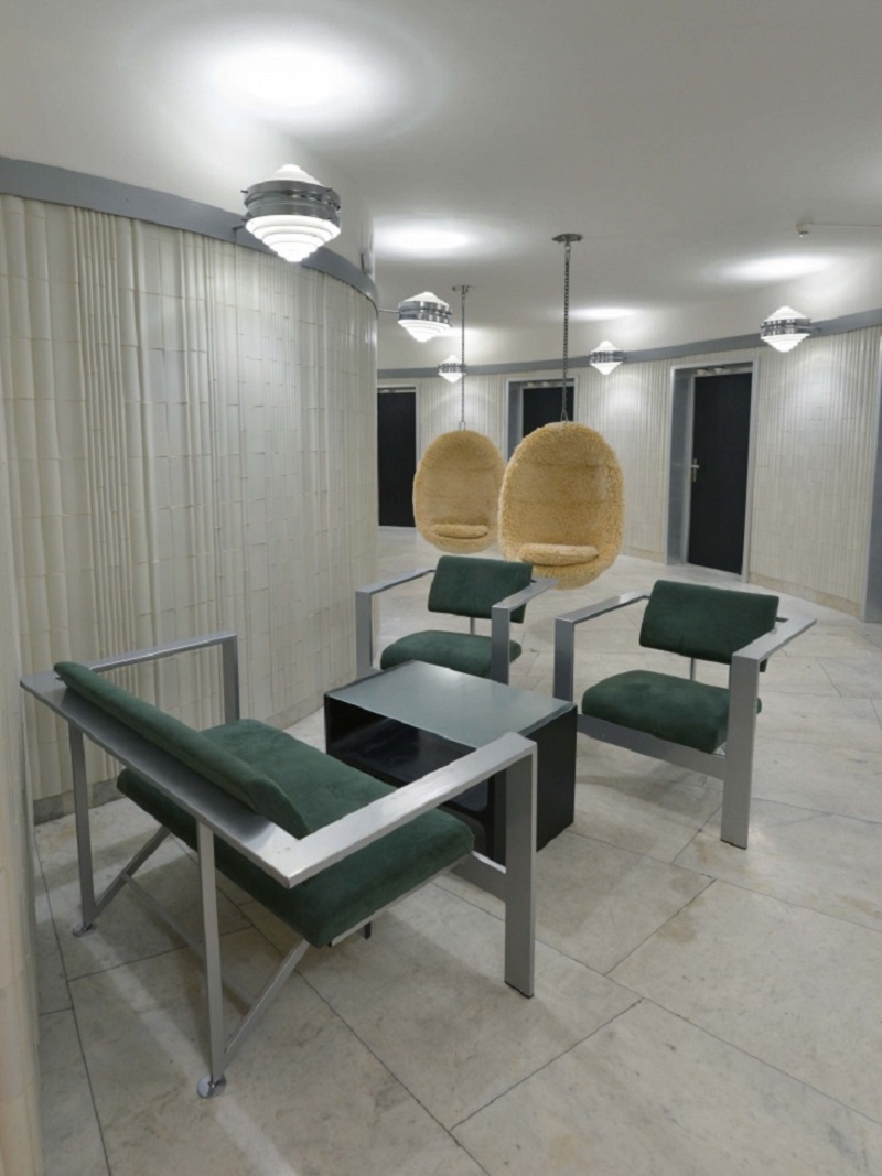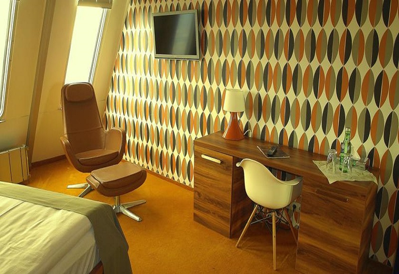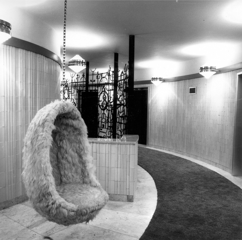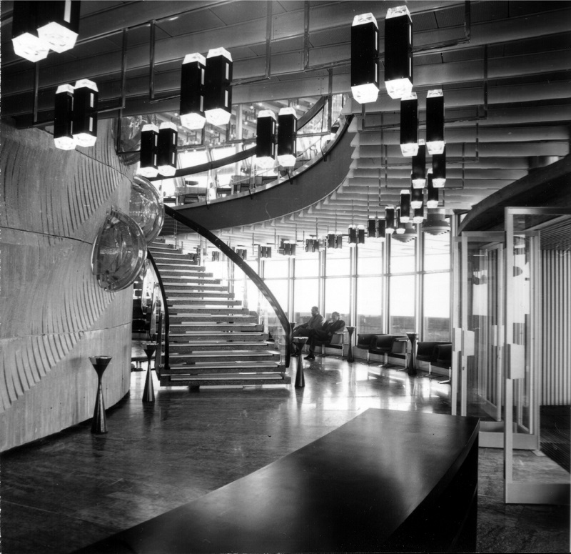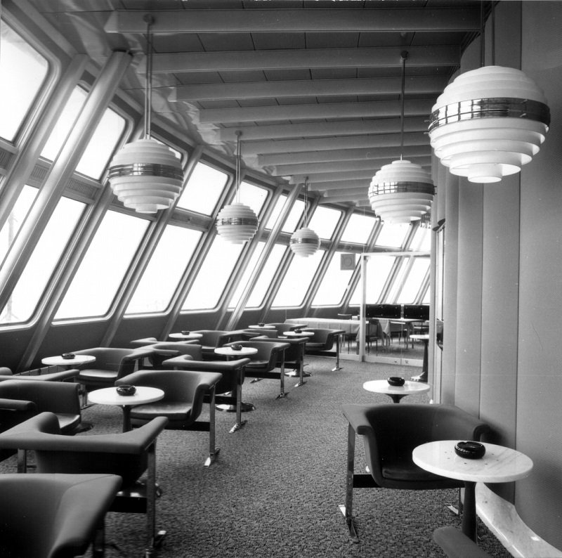 Typical of mid century modern design, most of all the wallpapers and chairs in the rooms fit the bill. Look inside and time travel to the space age future while peeking over the clouds through the aircraft-like windows.
