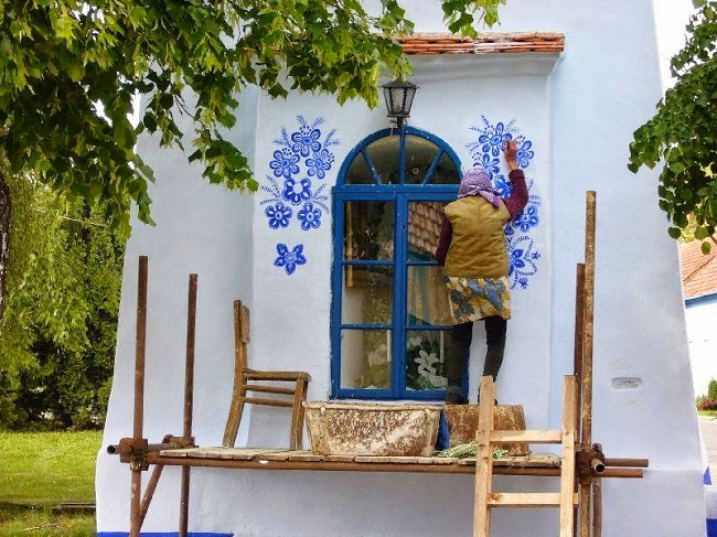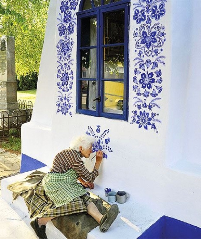 Every May, she spends 10 days decorating the freshly whitewashed walls of the village chapel, even climbing up ladders to reach the top!
